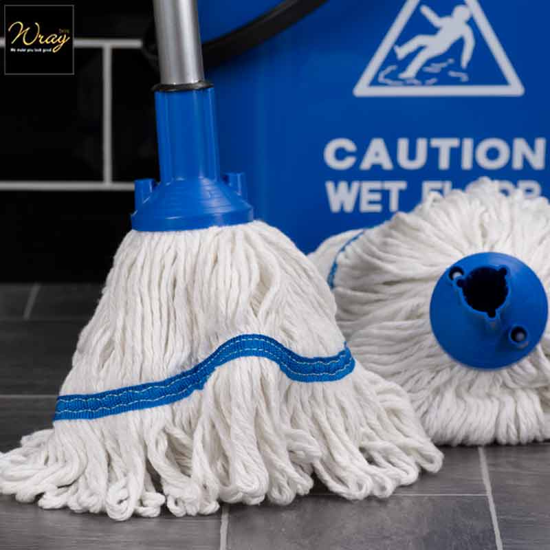 Produced from a unique 50/50 blend of bleached cotton and synthetic yarn for absorbency and strength. Improved performance circular profile looped white yarn with colour-coded band mop socket.